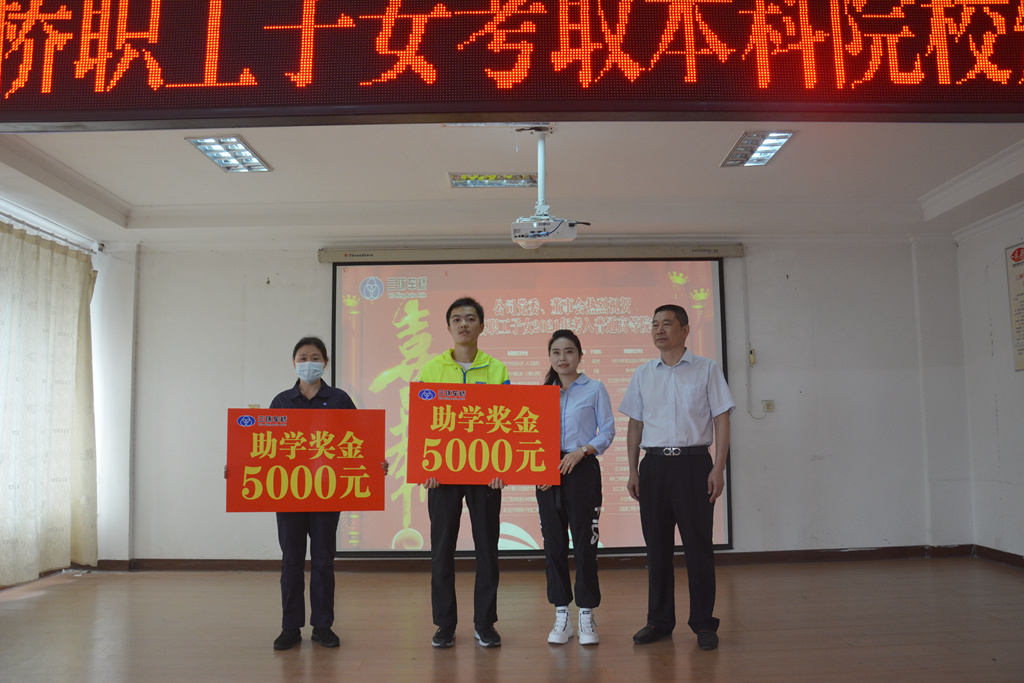今年7月份,公司出臺了考入本科院校的公司職工子女獎勵標準:考上清華、北大,一次性發(fā)放獎學金100000元;考上全國排名前十本科院校,一次性發(fā)放獎學金20000元;考上211本科院校,一次性發(fā)放獎學金5000元;考上普通本科院校,一次性發(fā)放獎學金3000元。今年,機加車間職工潘勇之子潘超文、車橋技術(shù)部張少卿之子張瑋龍被華中科技大學錄取,財務部劉天鳳之子劉昊原被南京理工大學錄取……共計有31名職工子女圓了自己的大學夢,并獲得公司助學獎金,獎勵金額共計133000元。